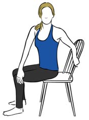 How: Seated on the edge of a chair with knees, toes and hips all facing forward, slowly turn your torso to the right as you exhale bringing your left hand to your right knee and your right hand behind you to a wall, desk, or chair. As you stay in this twist, inhale feel your spine lift up and exhale feel your navel actively squeeze back towards your spine. Stay 5-8 breaths then switch sides.