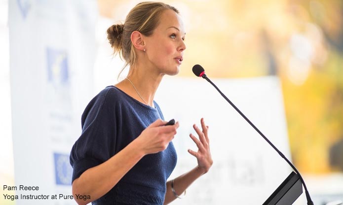 Why: It counteracts computer hunch so you stand tall rather than caved. Plus, it’s what we call in yoga a “cleansing breath” clearing out some space in your chest and lungs so you have room to breathe fully and access your voice.